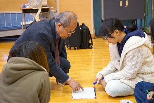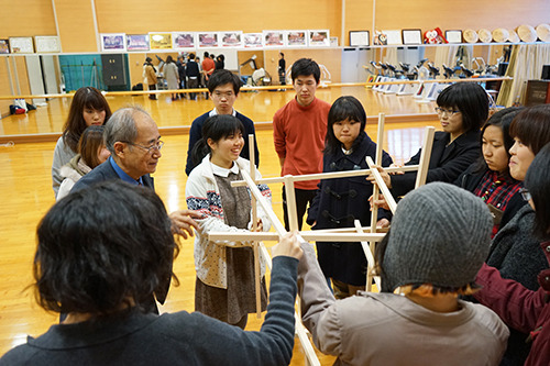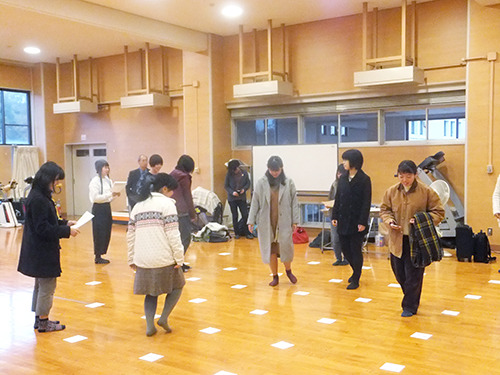 場所を体育室に移し、学生達は実際に体を動かしながら、立体迷路についてより理解したあと、学生自身が経路を考えた迷路を体験しました。