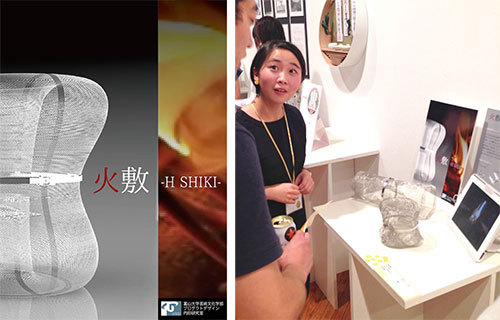 芸術文化学部からは、授業「プロダクトデザイン実習D」を受講する学部学生、交換留学生を交えた3名のチームがテーマ部門に出展し、共同制作の作品「火敷」が、アクシス誌(vol.178/2015年11月1日発売)にコンセプトと共に掲載されました。