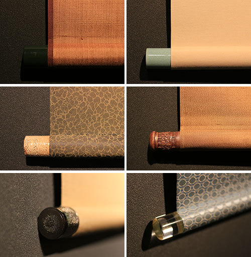 作品や表具に合わせて、材質や形状が選ばれます。表具師さんたちの感性や遊び心が光る、知る人ぞ知る、鑑賞ポイントです。