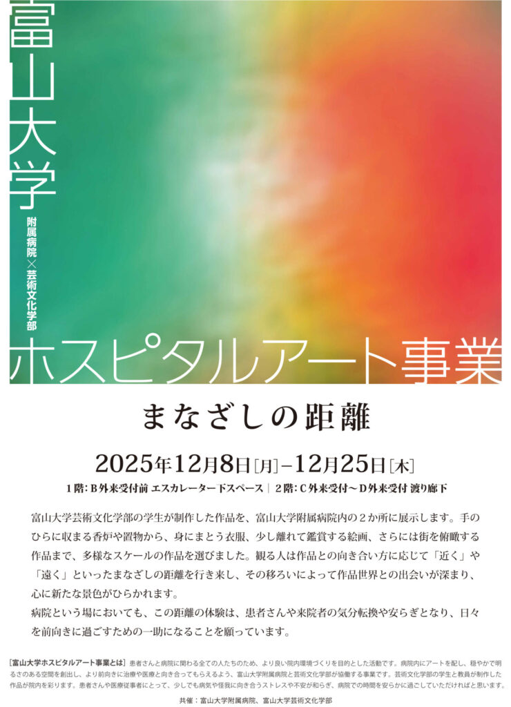 富山大学芸術文化学部の学生が制作した作品を、富山大学附属病院内の2か所に展示します。手のひらに収まる香炉や置物から、身にまとう衣服、少し離れて鑑賞する絵画、さらには街を俯瞰する作品まで、多様なスケールの作品が出品されます。 観る人は作品との向き合い方に応じて「近く」や「遠く」といったまなざしの距離を行き来し、その移ろいによって作品世界との出会いが深まり、心に新たな景色がひらかれます。病院という場においても、この距離の体験は、患者さんや来院者の気分転換や安らぎとなり、日々を前向きに過ごすための一助になることを願っています。患者さんやご家族にとっては、病気や怪我と向き合うストレスや不安が和らぎ、病院での時間がより良いものになればと思います。重い責任と使命の中で日々業務にあたる医療スタッフの方には、少しでも癒しや元気を受け取っていただければと思います。